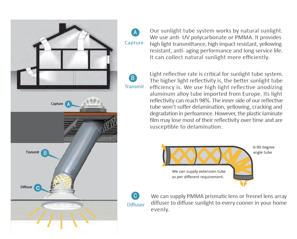 É feito de liga de alumínio anodizante que é forte e resistente à corrosão. Sem costura, a base de uma peça flash é projetada para evitar quaisquer possíveis vazamentos de água. A base alta pode impedir a clarabóia sendo coberta pela neve. Digite A vem com alto tubo rígido de liga de alumínio reflexivo. Varipitch e tubo ângulo de 90 graus estão disponíveis para trabalhar com todos os telhados para facilitar a instalação.